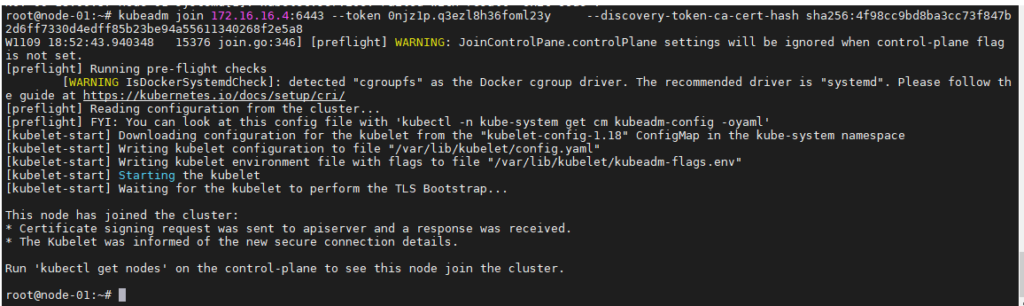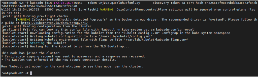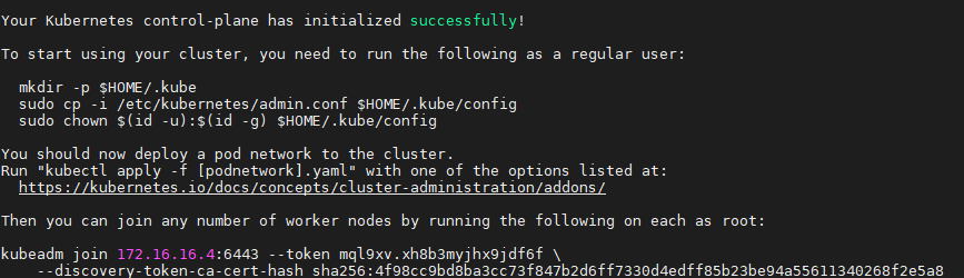 kubeadm join 172.16.16.4:6443 –token 0njz1p.q3ezl8h36foml23y –discovery-token-ca-cert-hash sha256:4f98cc9bd8ba3cc73f847b2d6ff7330d4edff85b23be94a55611340268f2e5a8