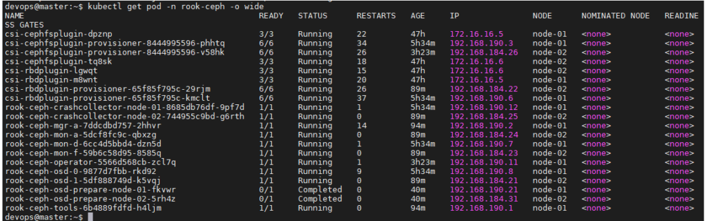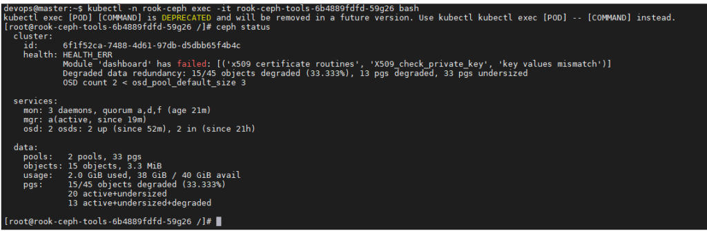 devops@master:~$ kubectl -n rook-ceph exec –it rook-ceph-tools-6b4889fdfd-59g26 bash
