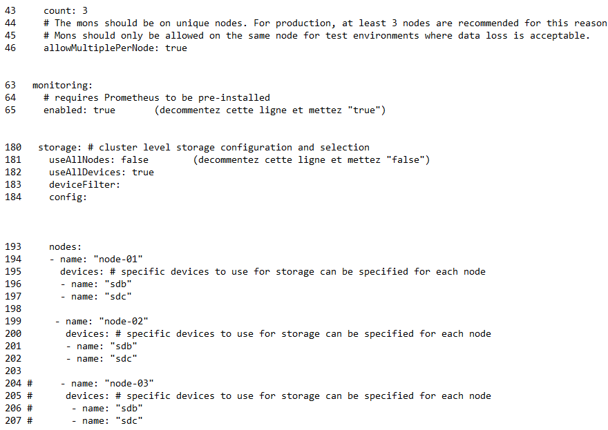 Il faudra modifier le fichier « cluster.yml » . Vous trouverez le fichier dans le repository suivant: https://github.com/moussdia/k8s-rook-ceph.git