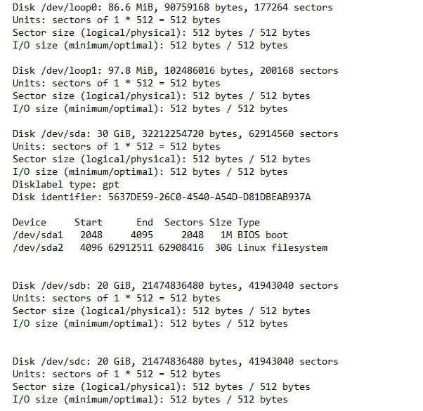 Vérifions l’état des disques sur chaque nœud et récupérer le nom des disques supplémentaires. Ces disques seront des daemons OSD pour CEPH.