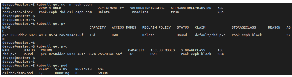 devops@master:~/rook/cluster/examples/kubernetes/ceph/csi/rbd$ kubectl apply –f storageclass.yaml