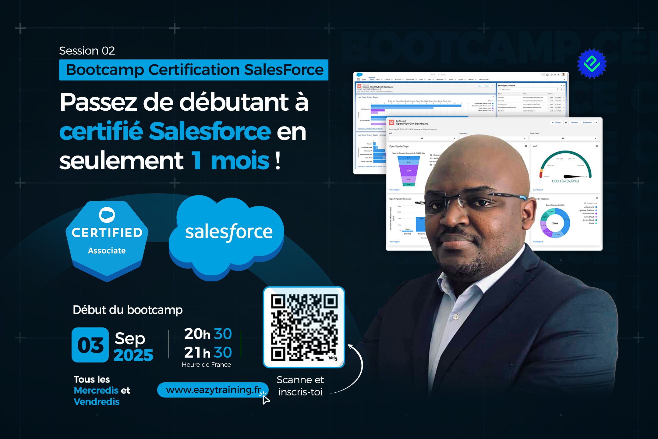 Rejoignez notre Bootcamp Salesforce et préparez-vous à la certification Salesforce Associate. Formation en ligne intensive, 100 % pratique, adaptée aux débutants et professionnels. Début : 07 Mai 2025 | Tarif : 300€ | Réservez votre place dès maintenant
