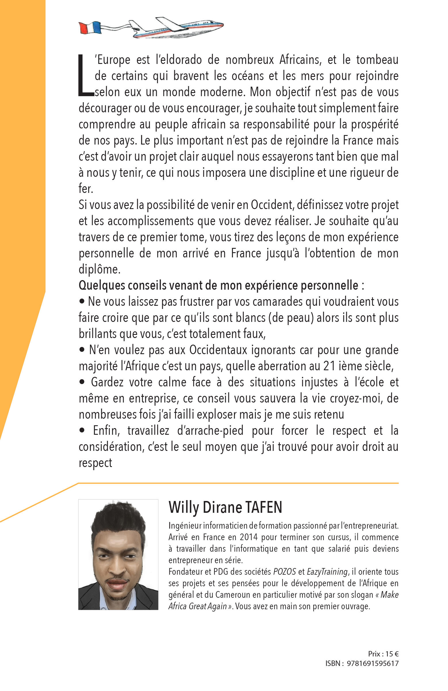 Si vous trouvez l’histoire édifiante, n’hésitez pas à parler du livre autour de vous afin que vos proches qui envisagent voyager puisse se le procurer. Cela leur permettra d’avoir un état d’esprit affûté pour affronter les nombreux pièges de l’occident et réaliser leur ambition.